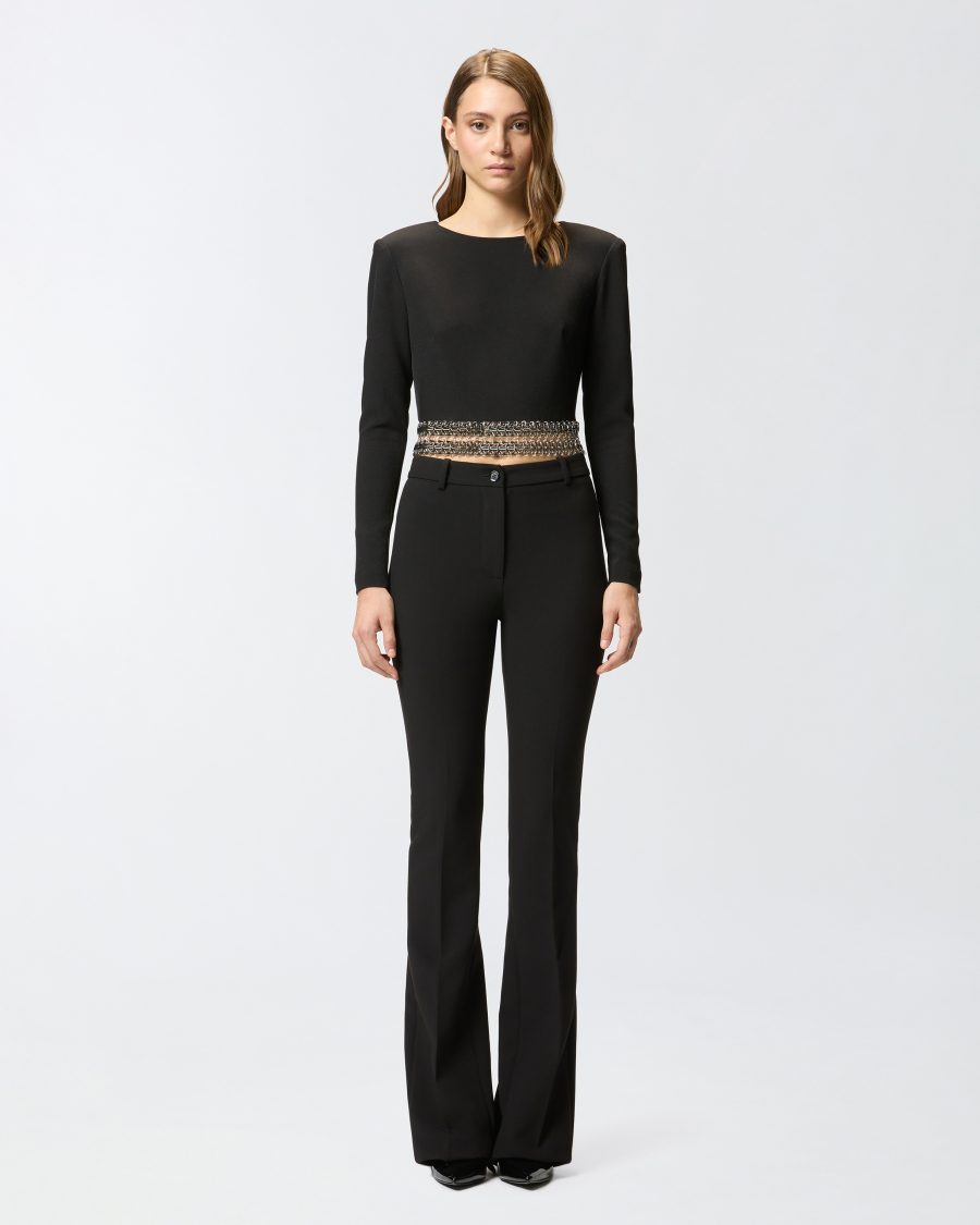 Long-sleeved top in viscose-blend crepe with button-fastened keyhole at the back and zip fastening at the cuffs to personalise the design. The back of the model features classic, tailor-like full-length seams, while the embroidered chain embellishments at the bottom give the design an original, sensual finishing touch. Make your evening looks shine with this simple yet refined piece.