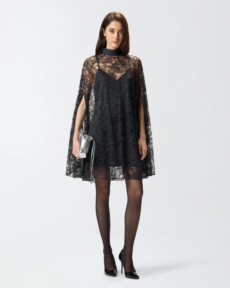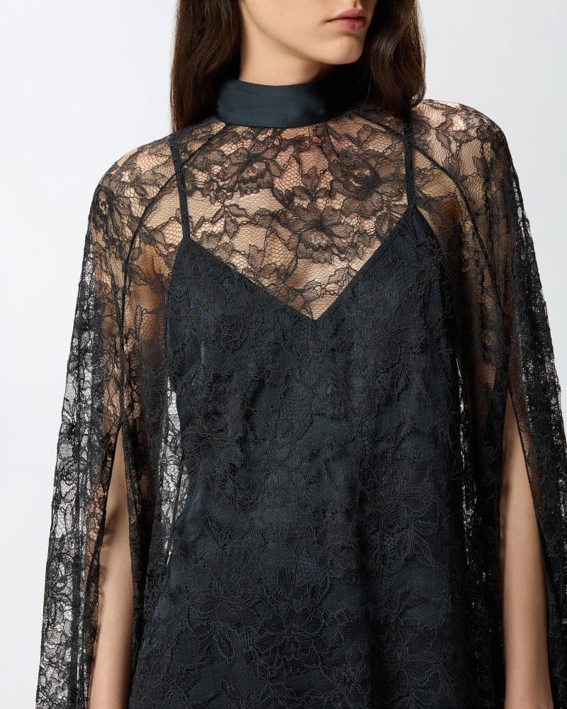 Short high-necked dress with loose lines and wide long sleeves with a slit at the front that allows the arm to come out slightly. Rebrodè lace with a very light and finely crafted floral motif covers the entire garment and is punctuated by the distinctive drawstring and satin details, such as the collar and slip. The minimalist cut of the design makes it perfect for elegant occasions and more.