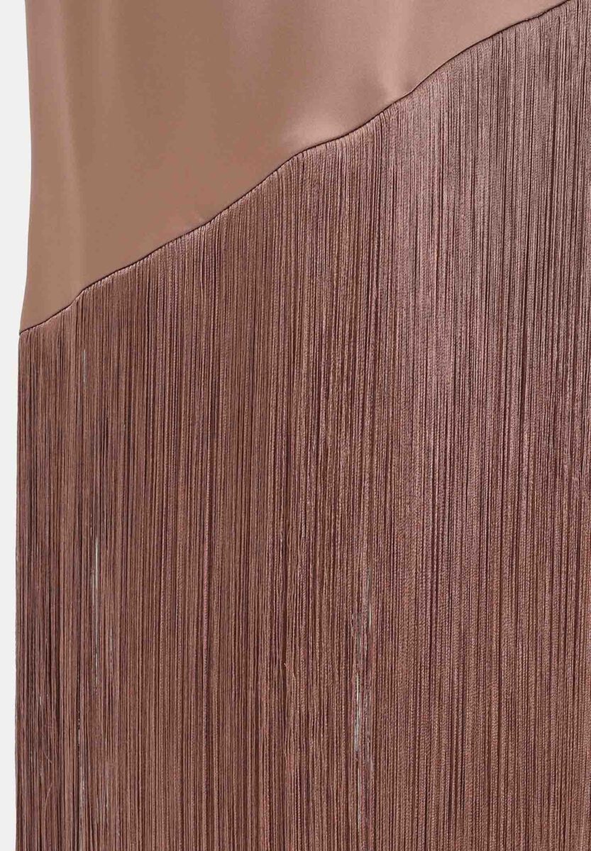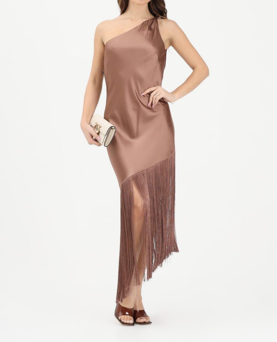 PINKO Kiwi midi dress for women in brown with an elegant and dramatic character, crafted from satin fabric with a luminous finish that hugs the figure with natural fluidity. The one-shoulder design lends a contemporary and refined touch, leaving one shoulder bare and accentuating the décolleté with minimalism. The fit is soft yet feminine, designed to follow the curves without constricting them, while the asymmetrical hem adds a dynamic and sophisticated touch. The bottom is embellished with long, thin fringes that create movement with every step, adding a glamorous and sophisticated touch to the ensemble. On the back, the line remains clean and simple, maintaining the contrast between the smooth fabric and the flowing effect of the fringes. A visually striking dress, ideal for evening events, ceremonies, or special occasions where you want to stand out with a bold and feminine style. The model wears a size 40 and is 175 cm tall. Medium-heat ironing is recommended. Spring/Summer seaso