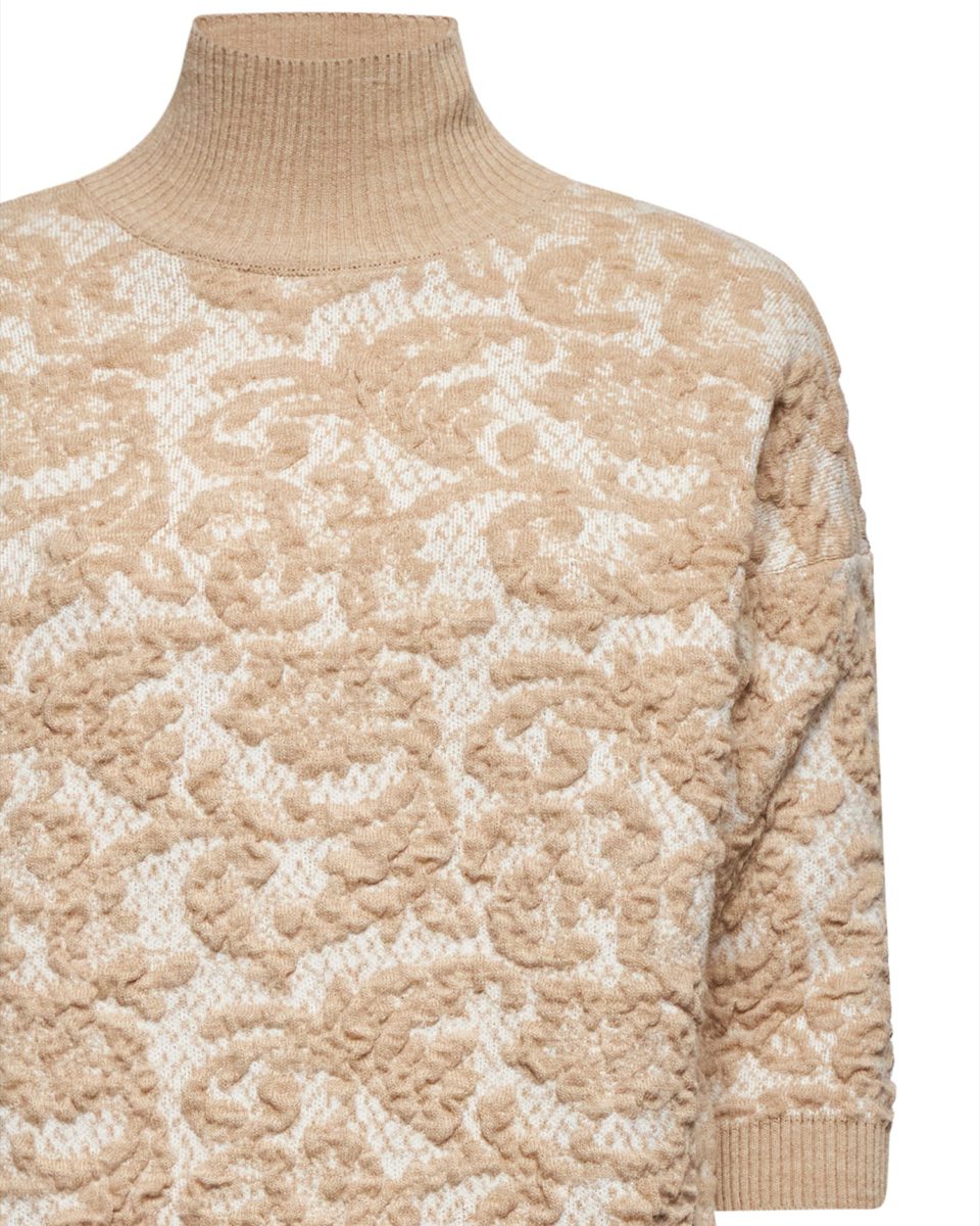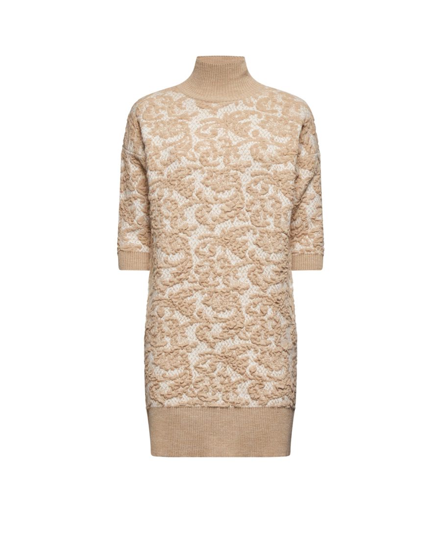 Un abito dritto dallo stile essenziale e moderno, con collo alto e maniche corte. La lavorazione effetto rilievo aggiunge profondità al look. Ideale per outfit minimal ma d’impatto.