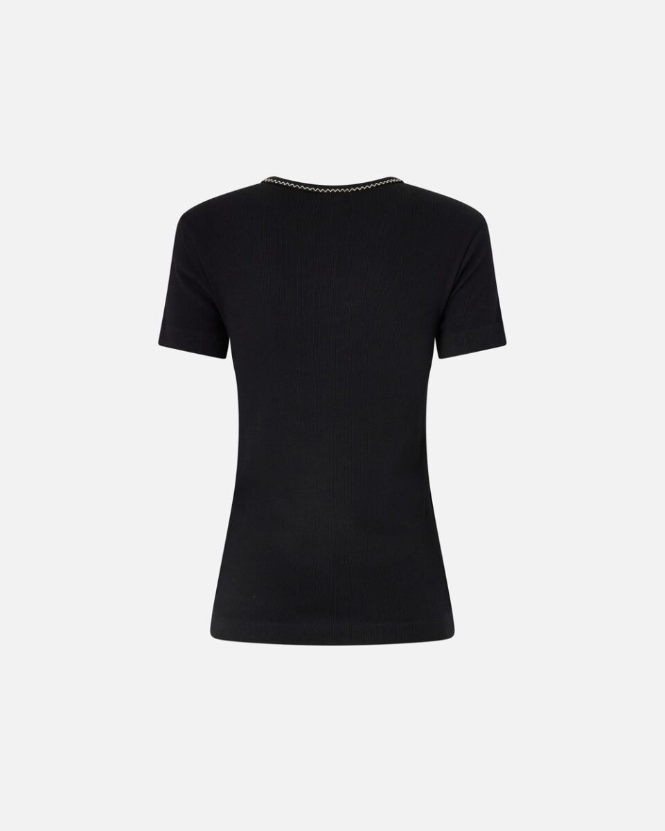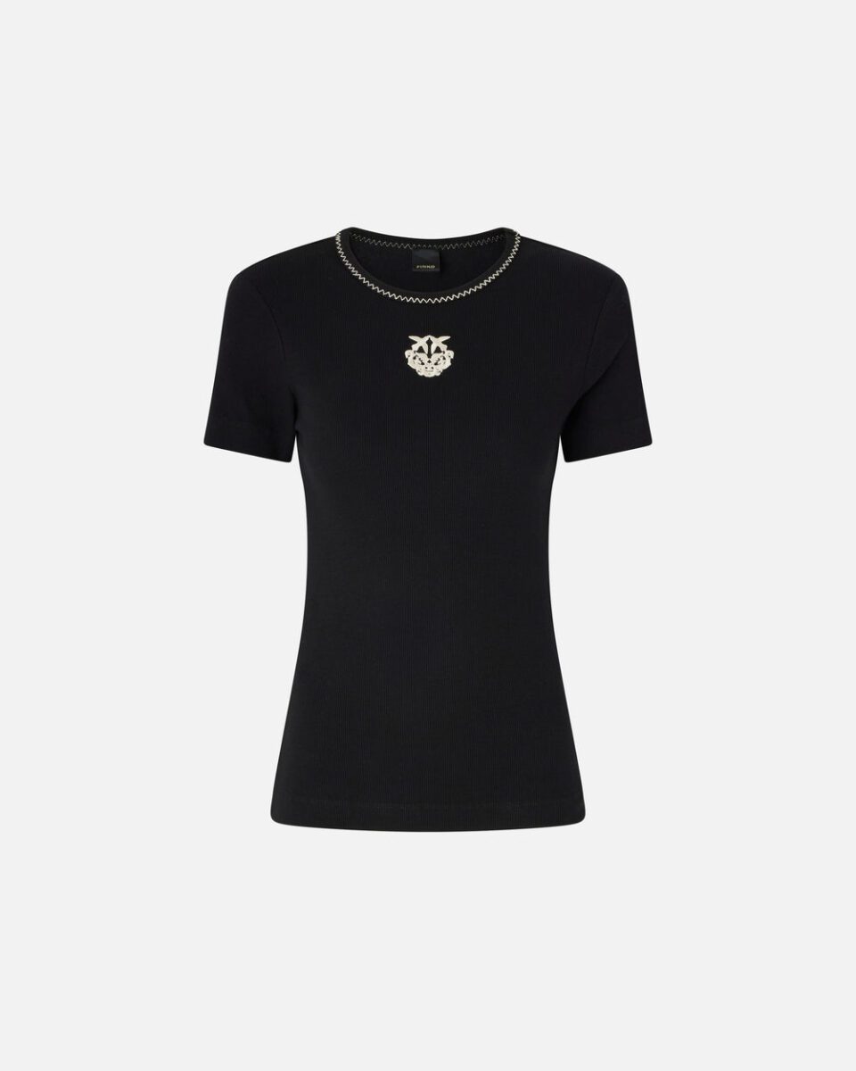 Κοντομάνικο t-shirt από καθαρό βαμβακερό ριμπ ζέρσεϊ ύφασμα με στρογγυλή λαιμόκοψη. Χαρακτηρίζεται από γαζιά διαφορετικού χρώματος στο περίγραμμα της λαιμόκοψης καθώς και από ένα κέντημα στο στήθος, επίσης διαφορετικού χρώματος, με το λογότυπο Love Birds σε καουμπόικο στυλ. Πρακτικό, πρωτότυπο και με μοναδικό στυλ: αυτό το t-shirt θα γίνει πραγματικό πασπαρτού